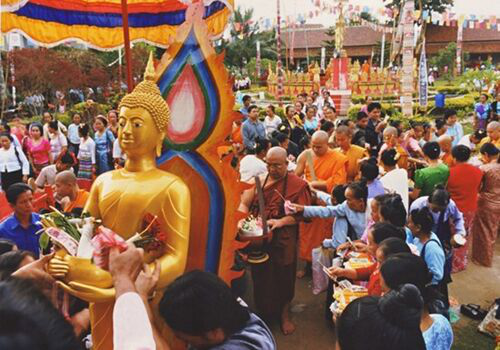 “奧瓦薩”時(shí)間在傣歷1 2月1 5日(陽(yáng)歷9月中旬)。這一天,表示從“關(guān)門節(jié)”以來(lái)的安居齋戒期已滿,男女老幼皆盛裝去佛寺里拜佛,以食物、鮮花、蠟條、錢幣獻(xiàn)佛,向佛祖懺悔,祈求佛祖賜福降平安,同時(shí)舉行盛大的娛樂(lè)集會(huì),“章哈”演唱,放高升、晚上放焰火、放孔明燈等,慶祝開(kāi)門節(jié)。此時(shí),雨季已過(guò),稻谷收割完畢,故也稱為慶祝豐收的節(jié)日。