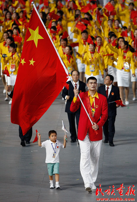 2008年8月8日,全國各族人民期盼已久的第二十九屆奧林匹克運(yùn)動(dòng)會(huì)在北京隆重開幕,圖為北京奧運(yùn)會(huì)中國代表團(tuán)入場儀式上,運(yùn)動(dòng)員姚明領(lǐng)著汶川大地震中最小的救人英雄林浩入場。《民族畫報(bào)》2008年第9期