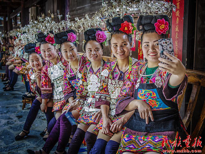經(jīng)歷改革開放40年的發(fā)展,我國社會(huì)生產(chǎn)力、綜合國力、人民生活水平實(shí)現(xiàn)了歷史性跨越,全黨全國各族人民要更加緊密地團(tuán)結(jié)在以習(xí)近平同志為核心的黨中央周圍,高舉中國特色社會(huì)主義偉大旗幟,不忘初心,牢記使命,將改革開放進(jìn)行到底,不斷實(shí)現(xiàn)人民對美好生活的向往,在新時(shí)代創(chuàng)造中華民族新的更大奇跡。圖為貴州民眾盛裝自拍?!睹褡瀹媹?bào)》2018年第3期