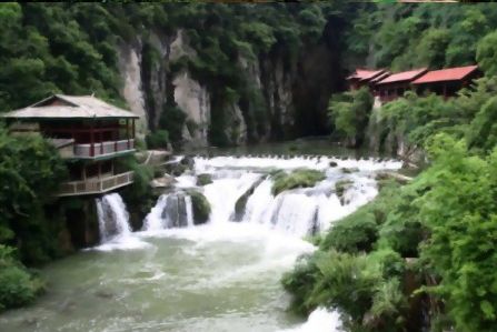 水洞下游有臥龍湖,水清可鑒,湖邊排列著水車、水碾、水磨、“香粑車”等等往時(shí)鄉(xiāng)間常見的農(nóng)家物,給人以既古樸又清新的感覺。與臥龍湖相連的是一處罕見的鈣化灘,足有200米長(zhǎng),灘面上瀑布流瀉,水簾溶洞星羅棋布,植被茂密,堪稱喀斯特景貌的一絕。這一帶,春來桃花爛漫,夏臨蘭草吐芳,金秋野菊盛開,初冬火棘紅艷,一年四季,風(fēng)景如畫。