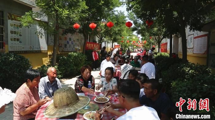 “孝善羊湯宴”將伏羊節(jié)推向高潮,當(dāng)?shù)卮迩f免費請“孝善人家”代表等“喝伏羊”。 付宏 攝
