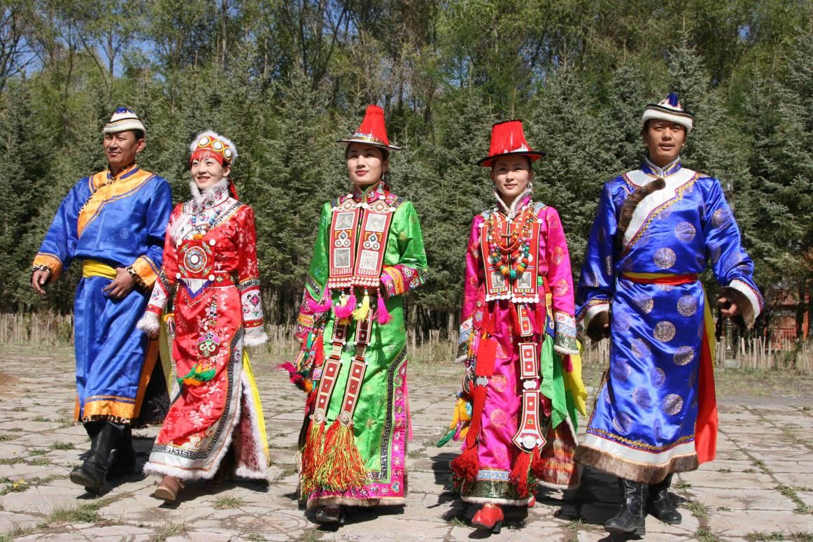 裕固族服飾大致可分為婦女服飾、未婚女子服飾和男子服飾三類。婦女服飾上有“衣領(lǐng)高、帽紅纓”的特征,婦女的帽子特點鮮明,東部各部落的婦女帽子形似禮帽,但頂部呈小圓頂形;西部各部落婦女帽頂則是尖頂,帽沿后部卷起。紅纓帽一般以芨芨草編織或羊毛搟制帽胚,用紅布做帽里,白布做帽面,帽沿為鑲有花紋的黑邊,帽頂配有紅纓,故稱“紅纓帽”。裕固族婦女服飾中的頭面是一件非常精制而價值昂貴的民間工藝品,用銀牌、珊瑚、瑪瑙、彩珠、貝殼等穿綴而成,共分三條,胸前左右兩條,背后一條。頭面也是裕固族已婚婦女和少女的區(qū)別標(biāo)志,婦女出嫁成婚后方可戴頭面。裕固族男子服飾也有其獨特之處,頭戴金邊白氈帽,帽沿后邊卷起,身穿大領(lǐng)偏襟長袍,衣料大多以布、綢、緞或褐子、獸皮為主,扎彩色腰帶,佩有腰刀、火鐮、鼻煙壺、煙荷包等飾品。裕固族有專門的婚禮服飾,色彩和配飾都有一定的規(guī)矩和要求。