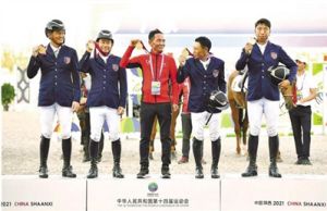 西藏競技馬術(shù)隊在第十四屆全運會馬術(shù)三項賽團體賽中奪得冠軍。