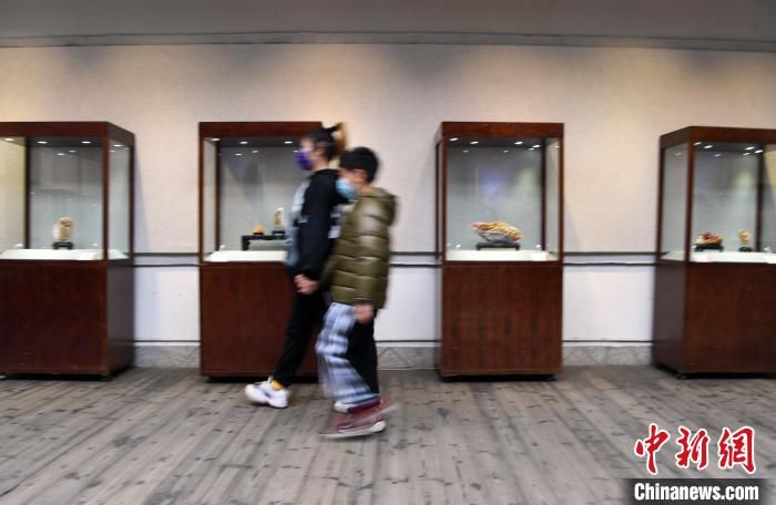 中國工藝美術(shù)大師葉子賢壽山石雕傳承展吸引觀眾觀看。 記者劉可耕 攝