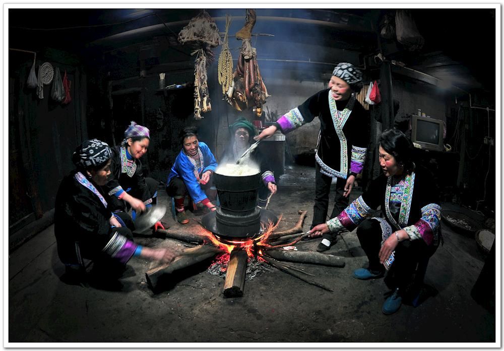 人略施小計(jì),使牛變成草食的家伙,省了口糧。人覺(jué)得這樣做對(duì)不起牛,所以仍讓牛住樓下老地方,一直住到現(xiàn)在;而且每年四月初八都蒸黑糯飯,殺雞宰鴨過(guò)黑飯節(jié),趁機(jī)給牛優(yōu)待,開(kāi)膳時(shí)抓一糰黑糯米飯供牛受用,有福同享,略帶“努都弱沙”澀味的染色飯食,不但別有一番風(fēng)味,還有祛濕消滯清熱的效能哩,營(yíng)養(yǎng)藥效兼而有之,對(duì)人對(duì)牛的健康都有好處;還特別給牛預(yù)備一捆綠油油的嫩草,有的人家還將一把嫩草吊掛于牛欄門(mén)口供牛作節(jié)食。這事著實(shí)令人感動(dòng),肚有墨水的人給它起了個(gè)雅致的名號(hào)叫?;旯?jié),意為牛是有靈魂的,它有恩于人,應(yīng)該三牲享祭,給牛安魂,替牛定魄,并在牛欄兩邊門(mén)縫和門(mén)口地面焚插鳧鳧香炷,牛欄門(mén)頭貼一片到幾、三五片巴掌般寬、七八寸的長(zhǎng)方形的紅紙,這玩藝不規(guī)則地染印顆顆金星,下垂一端呈鋸齒狀,微風(fēng)吹來(lái)“皮皮婆婆”地拂動(dòng),像一團(tuán)熱烈跳動(dòng)的火焰,祈求上蒼保佑牛像這紅紅的火焰一樣,祈求上蒼保佑牛健壯興旺。