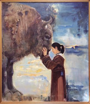 雍忠卓瑪?shù)膫€人畫展受到業(yè)內外的諸多好評,也有觀眾專程從外地去拉薩觀展。展覽結束當天,雍忠卓瑪特意和畫作《我和它》合影,并將合影發(fā)布在社交平臺上?!斑@是我與牦牛博物館結緣的作品。”她向記者介紹。畫面上,穿著藏袍的少女閉著眼睛,用左手撫摸牦牛的面頰,額頭輕觸牦牛鼻尖,表情寧靜祥和。