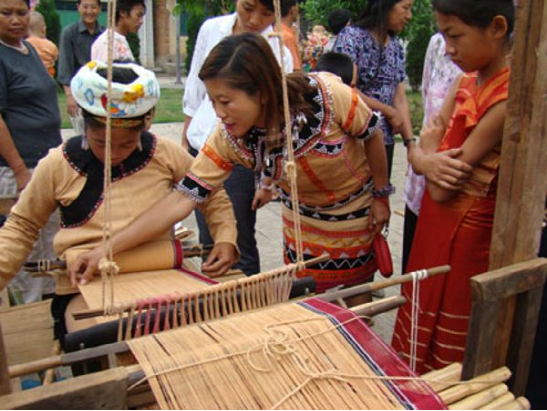 2010年上海世博會(huì)活動(dòng)周期間,一臺(tái)名為《記憶云南》的18項(xiàng)非物質(zhì)文化遺產(chǎn)展示成為最吸引眼球的亮點(diǎn)之一。活動(dòng)現(xiàn)場(chǎng),18名云南非物質(zhì)文化遺產(chǎn)傳承人和民間藝人展示白族布扎、納西族東巴畫(huà)、傣族剪紙、傣族竹編、佤族織錦技藝等制作技藝。其間展示的佤族織錦技藝在民族文化風(fēng)情濃郁,文化底蘊(yùn)深厚的耿馬縣佤族村寨里流傳甚廣。在耿馬的佤族村寨里,婦女們一般都會(huì)紡線(xiàn)織布,佤族傳統(tǒng)服飾也多用自染自織的土布縫制。此地佤族傳統(tǒng)服飾按地域分為兩大類(lèi)。一類(lèi)是分布在耿馬鎮(zhèn)、四排山鄉(xiāng)的傳統(tǒng)服飾,以女性身著佤族紅色短衣筒裙、男子身著佤族黑衣寬褲為標(biāo)志;一類(lèi)是分布在勐簡(jiǎn)鄉(xiāng)大寨村的“黃衣阿佤”服飾,以女性身著佤族黃衣筒裙、男子身著黃衣寬褲為標(biāo)志。佤族婦女所用的紡線(xiàn)有棉線(xiàn)、麻線(xiàn)兩種。棉主要是草棉,麻主要為苧麻和野生火麻,紡線(xiàn)采用內(nèi)地傳入的有紡錘的紡車(chē)。在耿馬鎮(zhèn)芒國(guó)村芒俄村民小組等佤族聚居村寨,筆者先后目睹了佤族織錦的全過(guò)程。只見(jiàn)紡織 中的佤族婦女一個(gè)個(gè)端坐在紡車(chē)前,凝神專(zhuān)注地操持著手中的活計(jì)。她們左手持麻,右手持紡錘,將紡錘放在大腿上一搓,紡錘轉(zhuǎn)動(dòng)起來(lái)后,把麻纖維慢慢從左手拉出并捻成線(xiàn),紡好一截線(xiàn)便將它繞到小竹棍上。如此這般不停地左右穿梭,又不斷地再搓、再捻,紡出的布匹紋理細(xì)密、結(jié)實(shí)挺拔。耿馬四排山鄉(xiāng)織錦的佤族婦女,大多采用一套竹木制的很原始的腰機(jī),前后上下共有十七個(gè)零件。紡線(xiàn)時(shí),她們將線(xiàn)的一頭栓在婦女腰上,另一頭用木棍穿好,擱在織布處釘在地上的兩根木樁上??棔r(shí)兩頭繃緊,將繞在木棍上的緯線(xiàn)穿到經(jīng)線(xiàn)的中間,然后用抒刀把線(xiàn)打緊。這種織法節(jié)奏雖然慢一些,但織出的布更加厚實(shí)緊繃,適用于紡織粗布和麻袋。在勐簡(jiǎn)鄉(xiāng)大寨村的穿“黃衣”的佤族婦女,用黃土、玉米粉、茶葉、小飯豆、欖樹(shù)皮等7種植物做原料浸染的黃色棉線(xiàn)織錦,使用的有竹木制腰機(jī)和紡錘紡車(chē)兩種??楀\時(shí),只見(jiàn)她們一邊捻線(xiàn),一邊傳遞紡錘。不織時(shí),又把紡錘和抒刀拆下,依然卷起放好。來(lái)自耿馬鎮(zhèn)、四排山鄉(xiāng)、勐簡(jiǎn)鄉(xiāng)的佤族群眾介紹,中華人民共和國(guó)成立后,由于商店里賣(mài)的布料比佤族自織的布料更價(jià)廉物美,佤族人家自己紡織制作服飾的已經(jīng)不多,但是縫制麻布被和麻袋用的麻布,還是多數(shù)來(lái)源于自家紡織,尤其是佤族村寨婦女穿的裙子,也必須是自己織,不然會(huì)被人同族人恥笑為愚笨和懶惰。2009年以來(lái),每年5月中旬,耿馬都要舉辦佤族“青苗節(jié)”慶典活動(dòng)?;顒?dòng)期間,該縣不僅上演豐富多彩的文藝節(jié)目和民間體育比賽項(xiàng)目,還現(xiàn)場(chǎng)展示該縣獨(dú)具特色的佤族織錦技術(shù)??楀\展示中,來(lái)賓增長(zhǎng)了對(duì)佤族傳統(tǒng)手工技藝方面的知識(shí),不少?lài)^(guān)群眾還饒有興趣地一邊詢(xún)問(wèn)織錦者,一邊親自動(dòng)手體驗(yàn)這項(xiàng)古老而傳統(tǒng)的紡織技藝。
