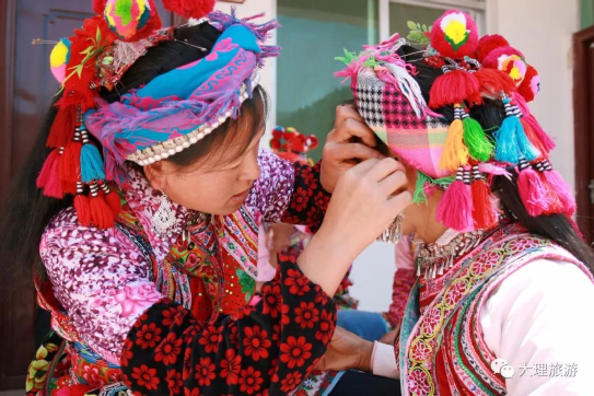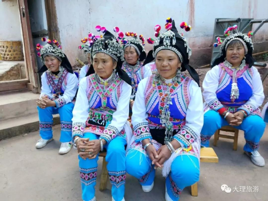 男子頭頂氈帽(又稱氈窩),穿大襟衣、大襠褲,赤足或穿草鞋,披羊皮,外出背皮袋(現(xiàn)已基本消失)。女子裹高包頭、額上飾銀桂花,衣為布襟,外套坎肩,腰系大圍腰,大圍腰左右下三邊繡五色花,為動植物圖案,足穿繡花鳳頭鞋,用本地產(chǎn)綠布條制褲子,不鎖腳邊,腰間背圓形白氈裹背,所穿服飾顏色鮮艷、質地厚重,盡顯遠古南詔皇室服飾遺風。