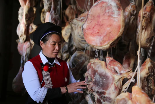 鶴慶火腿的美名,在滇西廣為傳頌。鶴慶火腿,又稱“圓腿”或是“盤腿”,取自其圓整的外形。制作鶴慶火腿,要精選皮薄肉嫩的后腿,經(jīng)過晾透、扎孔、噴酒、撒鹽,反復(fù)的摩擦之后,腌制陰干,鶴慶火腿滋味鮮美,咸香不膩,蒸制,煸炒,亦或是加在其他菜肴中增香提味,都是上佳選擇。