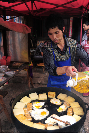 臭豆腐是平壩街的特產(chǎn),一直享譽(yù)滇東南。特別是在文山更是家喻戶曉。它火柴盒般大小,表皮長(zhǎng)滿一層白白的絨毛。若是蒸吃,先揀幾塊鋪在碗底,再撒撮鹽巴,放點(diǎn)食油,加些姜絲,放進(jìn)蒸鍋蒸熟。吃前用筷子攪和拌勻,看上去雪白,細(xì)嫩,宛若剛出籠的銀糕玉乳,散發(fā)出誘人的馨香。若用油煎,先將菜油舀進(jìn)鍋里,待鍋熱時(shí),立即放進(jìn)臭豆腐。隨著“嗤”的一聲,香味立時(shí)撲鼻而來(lái),再用小火耐心地將兩面煎黃,薄薄的黃皮內(nèi)含著一包乳漿。看了就讓人垂涎欲滴。