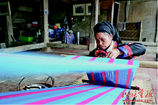 身著德昂族服裝的尹新勇今天要接待一批云南大學(xué)暑期社會實(shí)踐的師生,特意穿上了一身德昂族民族服裝?!拔沂菨h族,但是為了讓客人們感受德昂族文化,帶動三臺山旅游,我也常常會穿起民族服裝的?!币掠抡f。