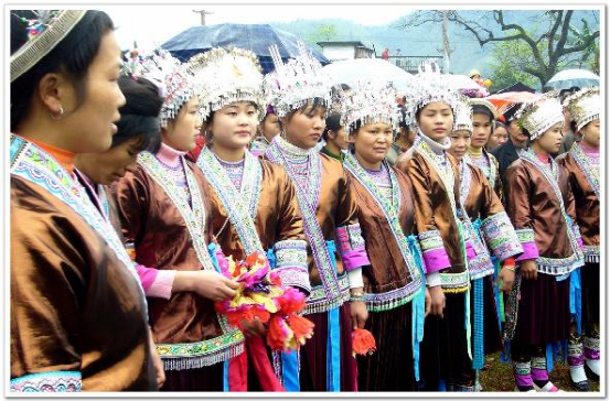 廣西融水縣的香粉古龍坡會于每年農(nóng)歷正月十六舉行,所以又名“十六”坡。這一天、來自外國朋友、各地的游客及當?shù)胤綀A十里的苗哥苗妹,提蘆笙,提鳥籠、牽馬匹,打花傘……朝著十六坡趕來。正午時分,山梁上、村道間、河溪旁,出現(xiàn)了成列成隊穿紅戴綠的人群。遠遠望去,似一條彩帶在飄動。當萬余人江集后,整個坡地就成了彩色的世界。