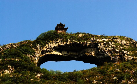 仙橋山位于貴州甕安縣城西南5公里的仙橋村,雄峙于南北伸展的長嶺之巔。山頂有一長方形穿洞,遠(yuǎn)望似一面中天明鏡,又若仕女發(fā)髻上的一匹玉簪。民間傳說,那高懸的“橋洞”,是神通廣大的仙人張三豐發(fā)怒時一拳擊穿的。站在“橋”下仰望“橋”頂,如巨粱橫亙天際,青崖黛壁,輝映云天。天衣無縫的“橋身”和兩邊的“橋墩”,渾然一體,構(gòu)成跨度約40米,寬20米,高約35米的“橋拱”?!皹蚬啊北泵娴摹皹蚨铡蹦_有形狀各異的石洞,曲徑相通。洞壁有形似人腳印石凹,傳說是仙人張三豐到此云游留下的足跡。