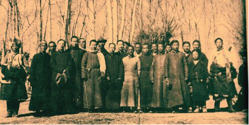 1948年,拉薩小學(xué)校長(zhǎng)邢肅芝(左起第七腰間佩槍者)應(yīng)邀赴尼泊爾訪問前與學(xué)校教職員及部分家長(zhǎng)合影留念