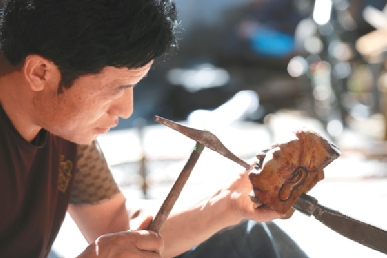 20歲前的次嘎已可以承接一些佛像的鍛敲任務(wù),掌握的技術(shù)遠(yuǎn)遠(yuǎn)超出一起學(xué)習(xí)的其他學(xué)徒們。從鍛敲佛像的蓮花底座、焊接,再到鍛敲銅佛造像上半身、下半身,再到慢慢地開始做些佛像飾物。偶爾,次嘎也能涉獵造像的臉部。這是一個造像師手藝達(dá)到最好時才可以觸及的部位?!懊娌拷Y(jié)構(gòu)復(fù)雜又微妙,面部表情的刻畫更是難上加難。作為一個造像師,這是最考驗功力的地方,每一次敲打都在決定作品的成敗。”次嘎說道。