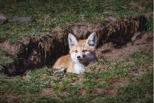 不知不覺中,太陽(yáng)已經(jīng)下山了。面對(duì)三只小家伙從警覺、驚喜、歡快到煩躁、無(wú)奈、焦慮的神態(tài)變化,我對(duì)記錄了小赤狐一天的喜怒哀樂而高興,又為小赤狐整整一天的忍饑挨餓而擔(dān)憂,趕緊收拾攝影器材,撤離它們賴以生存的家園,還它們一個(gè)不被打擾的寧?kù)o……
