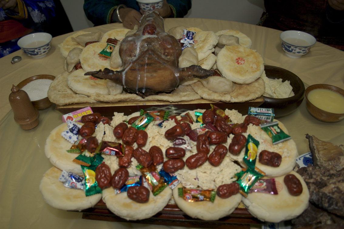 全羊席,又稱整羊席(蒙古語為“布禾勒”或“酥斯”),是蒙古人招待貴賓的傳統(tǒng)佳肴,也是蒙古民族最古老、最隆重的一道宴席,一般只在盛大宴會、隆重集會、舉行婚禮或接待高級貴賓時擺設(shè)。將整羊加工后擺在長方形的大木盤里,像一只臥著的羊,肉味鮮美,香飄滿堂。賓客在進餐前,還要舉行一定的儀式,高唱贊歌,朗誦獻整羊祝詞等。據(jù)文獻記載,成吉思汗曾設(shè)過全羊宴。忽必烈登基時,也設(shè)全羊宴祭神祇、待賓客。至清代全羊宴更加盛行,現(xiàn)已成為蒙古民族風格接待貴賓的名貴菜肴,馳名中外。