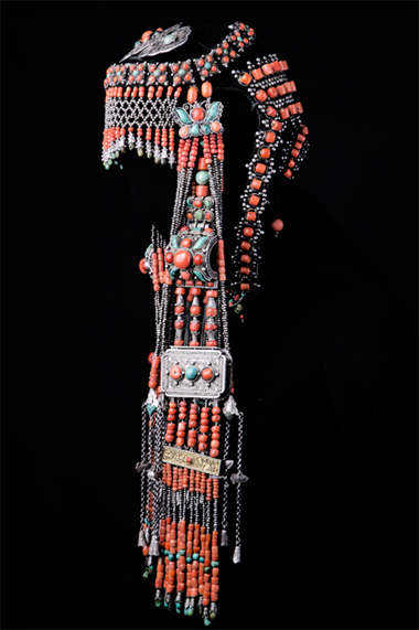 清代烏拉特蒙古族婦女頭飾, 具有著豐富的民俗思想和宗教思想。如頭飾中鑲嵌的珊瑚, 有的雕成日形, 有的雕成月形, 亦有山形、火形等等, 這與蒙古族自古以來(lái)的薩滿(mǎn)教崇拜有關(guān)。又如銀托座做成蓮花形、金鋼杵形或法輪形, 這又受喇嘛教的深刻影響。再如飾物做成魚(yú)形、蝙蝠形、壽字、喜字等等,則是中原漢族常用的吉祥圖案, 是漢文化滲入的反映。復(fù)如飾物上的珠子多為奇數(shù), 有三、九或是三、九的倍數(shù)等, 這是蒙古族長(zhǎng)期形成的民族吉數(shù), 以九為大。整個(gè)頭飾就是一部民族思想觀(guān)念的綜匯大成。