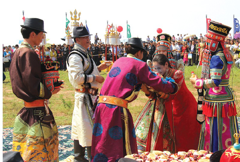 蒙古族婚禮儀程復(fù)雜,內(nèi)容豐富多彩,因地域、部族和傳統(tǒng)習(xí)俗的不同,各部落、各地區(qū)的婚禮形式和程序等方面也有較大差別。如錫林郭勒盟烏珠穆沁的婚俗儀式由定親、下聘禮、訂婚期、請客人、縫制氈包、婚禮前的準(zhǔn)備、互贈禮品、雙方各自舉行婚宴、娶親、送親、迎親、男方家的婚宴和儀式、宴請幫忙的人、入洞房、回看姑娘等儀式程序。