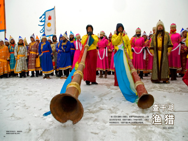 據(jù)記載,一千年前的遼金時(shí)期,這里就是天然的漁獵之地。傳說(shuō)遼帝圣宗喜吃“冰魚(yú)”,每年臘月,便率領(lǐng)家眷浩浩蕩蕩來(lái)到冰凍的查干湖上扎營(yíng)。遼帝在行宮中接見(jiàn)大宋使臣,商談國(guó)家大事,會(huì)見(jiàn)部落首領(lǐng),命令仆人將帳篷里的冰層刮薄,直至薄如紙片,冰下游動(dòng)的魚(yú)清晰可見(jiàn)。吃飯時(shí),便將薄冰輕輕擊破,水中鮮活的魚(yú)兒會(huì)急不可待地跳出冰面,歷史上 把這種捕魚(yú)方式叫“春捺缽”。