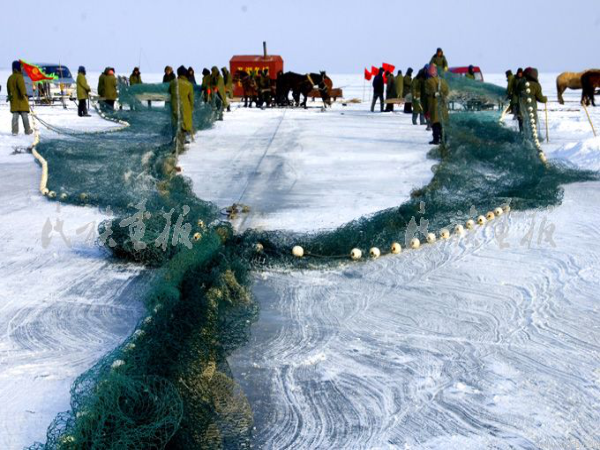 隨著“魚(yú)把頭”高亢的號(hào)子,馬拉人拽,一張幾千米長(zhǎng)的大網(wǎng),被緩緩地拉出冰面。鯉魚(yú)、鯽魚(yú)、鰱魚(yú)、鯰魚(yú)等各種魚(yú)類(lèi)一群一群翻上了冰眼。轉(zhuǎn)眼之間,冰面上堆起了一個(gè)個(gè)魚(yú)垛。