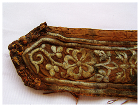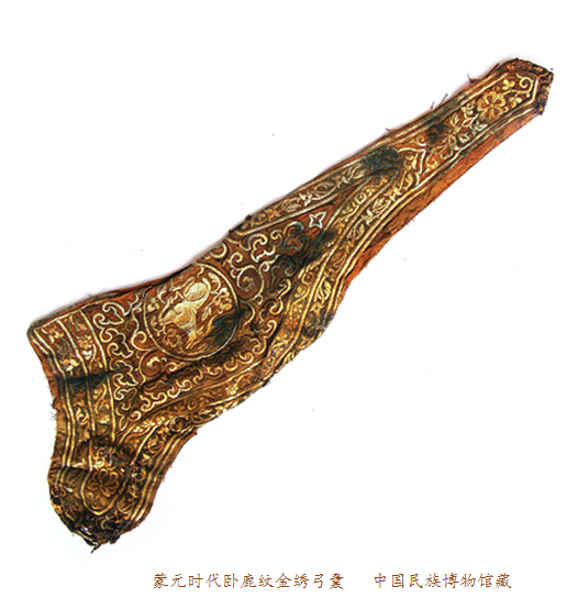 中國(guó)民族博物館館藏的臥鹿紋金繡弓囊通長(zhǎng)72CM,最寬處25CM,最窄處6.5CM。面料為絹地,呈深褐色。專家推斷其入土前應(yīng)內(nèi)襯樺樹(shù)皮或獸皮類框架。弓囊正面以銀裹金錢繡滿圖案,整體金碧輝煌。由于埋藏地下數(shù)百年,弓囊兩端的鐵質(zhì)穿環(huán)和皮條已銹蝕腐爛。