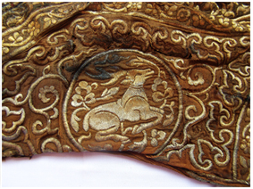 現(xiàn)在,我們就看見(jiàn)一只鹿,靜臥于金繡弓囊的中央。飛揚(yáng)流動(dòng)的黃金絲線勾勒出它宛如花朵一般的角,流露出遠(yuǎn)古神話對(duì)于鹿角神力的幻想和贊美。它以溫柔、嫻靜、優(yōu)美的姿態(tài),安祥地伏于卷草花卉紋中。曾經(jīng)與之相伴的弓影早已遠(yuǎn)去,嗖嗖作響的箭聲也已留在歷史那端。現(xiàn)在,它遺世獨(dú)立。