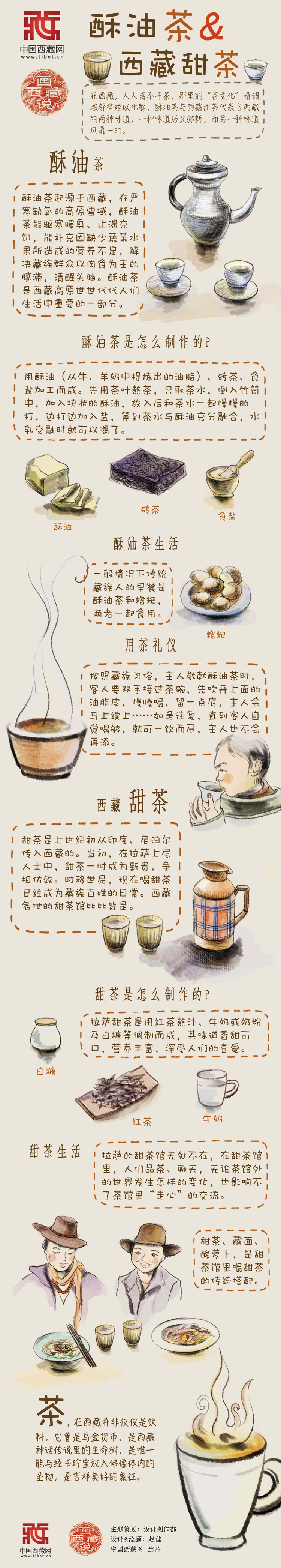 西藏人的飲料以茶為主,喝茶是藏族、門巴族、珞巴族日常生活中不可缺少的一部分。生活在西藏高原上的人一般早上都要喝茶,最喜歡喝的是酥油茶,還有奶茶和清茶。打酥油茶之前先將磚茶或[刪]熬成汁,濾出茶葉,將茶汁倒入專用陶罐內(nèi)盛放,隨用隨取。打酥油茶時(shí),先從存放茶汁的陶罐內(nèi)取出適量的茶汁,加上適量的開水和食鹽,倒人酥油茶桶內(nèi),放上酥油,上下抽動(dòng)酥油茶桶內(nèi)的攪桿幾十下,使酥油與茶水充分交融,倒出來便是香噴噴的酥油茶了。女主人把打好的酥油茶盛在陶質(zhì)酥油茶壺內(nèi),將壺坐在陶質(zhì)羊糞火爐上保溫,現(xiàn)飲現(xiàn)倒,始終是熱的。因?yàn)榇蚝玫乃钟筒枰3趾銣?,既不能燒開,也不能讓其涼了。若再燒開,茶就變味不好喝;若放涼了,則茶里的酥油趨于凝固不好喝。羊糞火爐里的羊糞[刪]火是暗火,能使壺里的茶既不開也不涼。非常適合藏家人的這一生活需求。西藏一年到頭氣候干燥,生活在這里的人一天到晚離不開茶,一般早茶必須是酥油茶,中午以后則喝不加酥油或牛奶的清茶。