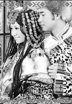 藏式婚禮上,身穿盛裝的一對新人 一、 懸掛經(jīng)幡,真誠祈福 藏式婚禮的儀式上,婚禮雙方家庭首先...