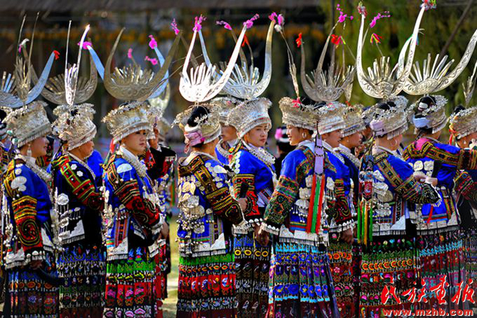 過苗年時,貴州苗族未婚少女穿戴起了體現(xiàn)家庭財(cái)富的銀飾。郭建軍攝影,引自民族畫報(bào)
