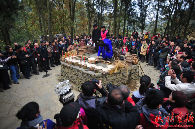 “四月八”的由來傳說甚多,主要是為憑吊“四月八”葬于今噴水池一帶的古代苗族英雄,輩輩相傳,而成習(xí)俗。傳說古代有一個名叫“亞努”的苗族首領(lǐng),領(lǐng)導(dǎo)苗民向統(tǒng)治者進(jìn)行斗爭。他曾組織各寨苗族頭人在“喝血坳”地主喝雞血,發(fā)誓共同聯(lián)合,戰(zhàn)斗到底。并約定四月八日在某山聚眾起義。起義后,義軍連連獲勝,一直打到了四川、貴州。第二年的四月八日,亞努不幸戰(zhàn)死在貴陽市的噴水池附近。苗族人民為了紀(jì)念這位民族英雄,便于每年的四月八這一天,舉行紀(jì)念活動,追思亞宜的業(yè)績,為戰(zhàn)死者掃墓。清代乾嘉苗民起義后,統(tǒng)治者禁止湘西苗族人民舉行這一活動,新中國成立后經(jīng)國家民委批準(zhǔn),將“四月八”定為苗族統(tǒng)一的節(jié)日(圖為2015年貴州松桃苗族“四月八”節(jié)慶盛況,引自貴州銅仁政府網(wǎng)“同仁社區(qū)”)。
