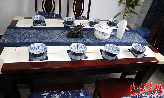 楊文斌老師和她的夫人梁定芳老師都是“非遺”傳承人。現(xiàn)在他們忙著著書、講學(xué)、開研討會(huì)。談起蠟染、談起民族民間工藝,楊文斌老師滔滔不絕:“現(xiàn)在要從三個(gè)方面認(rèn)識(shí)和研究民族民間工藝:一是從歷史學(xué)、人類學(xué)、民族學(xué)的角度解讀,二是從審美學(xué)、藝術(shù)視覺(jué)理念的角度解讀,三是從工藝學(xué)、材料學(xué)、技藝學(xué)的角度解讀?,F(xiàn)在植物染料的加工和染色技藝消失得很快。老祖宗留下的寶貝到我們這代可不能扭曲和斷裂?!?/p>