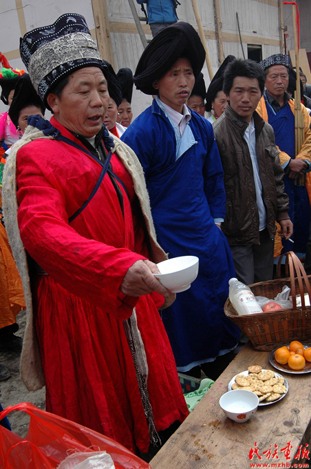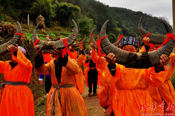 “黃袍錦衣”的寨老手捧牛角帶領族人前去“跳洞”,他們一邊走、一邊舉行祭儀
