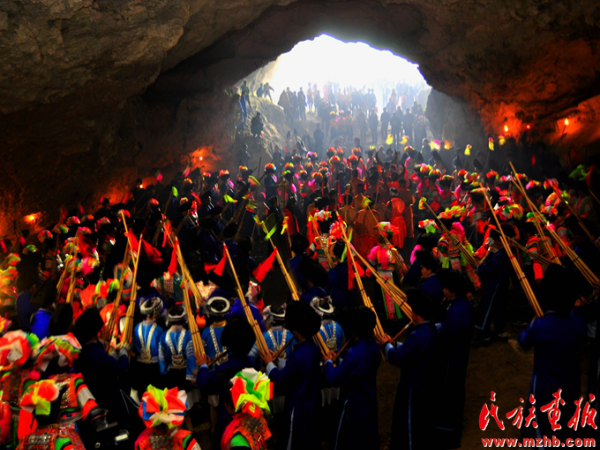 苗族同胞們身著節(jié)日盛裝,在溶洞里舉行“跳洞”,祭祀先祖,祈禱來年風調雨順