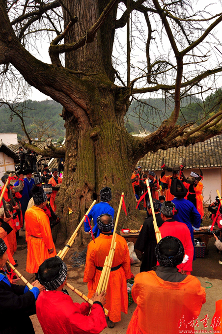 寨老引領眾人來到寨中央的千年銀杏樹下進行祭樹,寨老高舉牛角、男人們吹起蘆笙圍著古樹轉圈,司儀唱起“古歌”祈禱