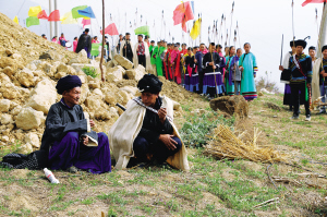 之后,孩子們帶著勝利的歡笑凱旋而歸,集中在一個寬敞的壩子里,圍坐成一堆。大人們將買好的豬或羊,按順時針方向繞著孩子們轉(zhuǎn)9圈,同時口誦祝咒之辭。咒誦完畢后,大人們就開始殺豬宰羊。至此,災(zāi)害得以禳解,預(yù)示孩子們來年將無病無痛,健康快樂地成長。