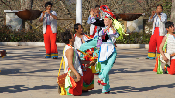 大三弦舞又叫“阿細跳月”,流傳于云南撒尼和阿細民間的一種舞蹈。據傳大三弦舞來源于刀耕火種時代。跳這種舞時,男子一字排開,彈著三弦或吹著笛子跳。隨著節(jié)奏抬腳踢腿,向前退后、向左向右交換舞步。女青年亦一字排開,腿上的動作與男青年一致。不同的是女青年要拍手,原地跳一段節(jié)奏,由左向右轉一個圈,輪回反復。有時男子向前沖,女子向后退,富有情趣。