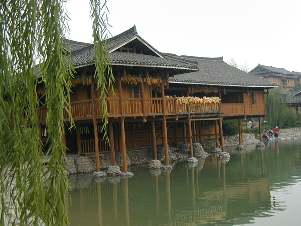 壯族多聚居在崎嶇的山區(qū)和群峰之間的丘陵地帶,壯族人民因地制宜創(chuàng)造了獨(dú)居特色的干欄式建筑。壯語稱屋為“欄”或“干欄”。干欄建筑使用木(或竹)柱做成離地面相當(dāng)高的底架,再在底架上建造住宅。樓上住人,樓下豢養(yǎng)牲畜和貯存物件。這種住宅適于潮濕多雨,地勢不平的南方山區(qū)。