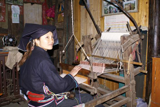 從前壯族鄉(xiāng)村,普遍掌握制作藍(lán)靛及印染方法。一般置一大缸,將藍(lán)草放入浸泡,加石灰使之分解、發(fā)酵,經(jīng)過化學(xué)變化,而后濾去殘渣,蒸發(fā)水分,凝成糊狀藍(lán)色染料。其間需不斷攪動,使色素充分化解?!懊康宀萘俳?,造成一百斤之靛為佳。”因產(chǎn)量較多,遠(yuǎn)銷廣東。浸染時,將適量靛糊化于染缸中,同時將雞血藤搗碎加入。布要反復(fù)浸泡多次,晾泡結(jié)合,直到染為深藍(lán)色。其間雞血藤釋放出一種紫紅色的植物膠,將藍(lán)靛色素粘在纖維上,是色素耐水耐腐耐紫外線,不易褪色,并有若隱若現(xiàn)的亮點,結(jié)實美觀。這個過程,運用了化學(xué)分解法。