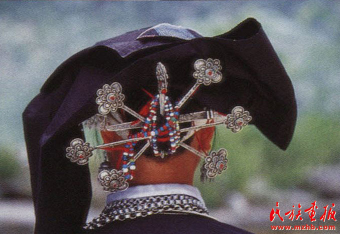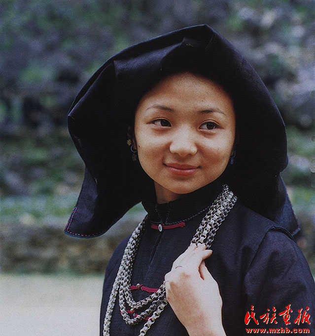 婦女的服飾更具特點(diǎn),無論老少,都喜歡穿右蓋大襟和葫蘆狀矮腳圓領(lǐng)的緊身短式上衣,下身以寬褲腳、大褲頭的褲子相搭配,腰系黑布做成的大圍裙,頭帶黑布大頭巾。其圍裙既寬且長,戴時能系周身有余,裙底垂掛到小腿下部,圍裙不僅作為裝飾,而且可以作為勞動工具,遇趕圩或走親訪友和勞動時,可將圍裙底翻卷上來作成小包袱,用以包裝和盛裝物品。婦女頭巾都是一塊自己紡織染成的長條黑布,戴時先圍繞在頭上,然后翻折擺布成火棱形的圖樣,罩在整個頭上,再把頭巾的兩端分別垂掛到雙肩上,看上去樸素美觀。同時還可以當(dāng)做帽子遮蔭用。她們的衣邊、衣角、袖口、裙邊和頭巾的四邊都用紅布或黃布剪成小條以后鑲捆上去,有的則用紅、黃、藍(lán)色絲線繡成波浪形的線條,使黑中襯出紅、黃、藍(lán)色的線條來,清雅明亮,色彩協(xié)調(diào)。再加上頭發(fā)插著龍頭形的銀簪,頸項(xiàng)上帶有銀鏈或項(xiàng)圈,手帶銀圈、玉鐲,耳掛珍珠耳環(huán)等,使人一看,黑中閃艷,樸素之中亦有玲瓏之美,表現(xiàn)了她們獨(dú)特的審美觀。