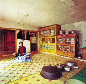朝鮮族傳統(tǒng)住房不論什么結(jié)構(gòu),都是滿屋炕。進(jìn)屋脫鞋,席炕而坐是他們的習(xí)慣。房門的門檻很高,進(jìn)門是一塊一二平方米大小的屋地,接著是凹下去1米左右的燒火坑,里面是灶膛,放燒柴,平時(shí)蓋著木板,或添足燒柴坐在上面炊事。這樣,蓋板、灶臺、炕面在同一平面,像延伸了的火炕,既干凈又防火。因房屋較矮,又有大面積的火炕,加上明亮的玻璃窗,在