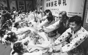 “花甲宴”非常隆重。壽宴當日,花甲老人由兒女為其換上嶄新的民族服裝,在洞簫、伽倻琴的伴奏聲中,端坐在壽席中央,接受晚輩們的跪拜大禮。按照傳統(tǒng),花甲老人身后要擺放繪有松鶴圖的屏風,取長壽之意。屏風兩側(cè)手書對聯(lián)“父親的恩情比山高,母親的大愛比海深”,橫批是“某某花甲壽宴”。