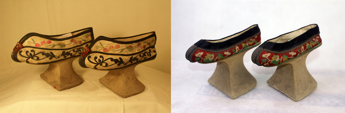 “旗鞋”款式獨特,是一種高木底繡花鞋,又稱“高底鞋”“花盆底鞋”“馬蹄底鞋”等。其木底高跟一般高5-10厘米,最高可達25厘米。一般用白布包裹,然后鑲在鞋底中間腳心部位。跟底形狀通常有兩種,一種上敞下斂,呈倒梯形花盆狀。另一種是上細下寬、前平后圓,其外形及落地印痕皆似馬蹄。“花盆底”和“馬蹄底”鞋由此得名。除鞋幫上飾以蟬蝶等刺繡紋樣或裝飾片外,木跟不著地的部分也常用刺繡或串珠加以裝飾。有的鞋尖還飾有絲線編織的穗子。這種鞋的高跟木底極為堅固。