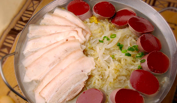 滿族有灌制血腸的習俗。多在臘月殺豬時制作。用豬血,加鹽、姜、辣椒粉、味精的調(diào)勻,灌入豬小腸之中,所用腸以不足二尺為宜,兩端用細繩扎牢,血漿不可充的太滿,以免煮時脹裂。煮到一定程度時要用一干凈的鋼針在腸上刺一些針眼,一則排放氣體以免膨脹迸裂,二則掌握火候,一俟沒有血水自針孔洞中滲出,即撈出冷開水或冷水中。食時片成片,可以直接夾食,也可以醮以醬油、醋、蒜泥、姜汁、辣椒油等食用。既鮮美爽口,又多食不膩,佐酒下飯均宜。