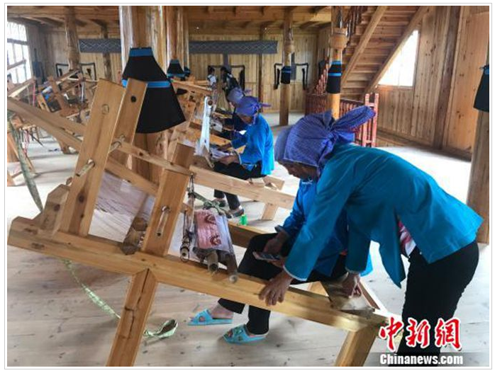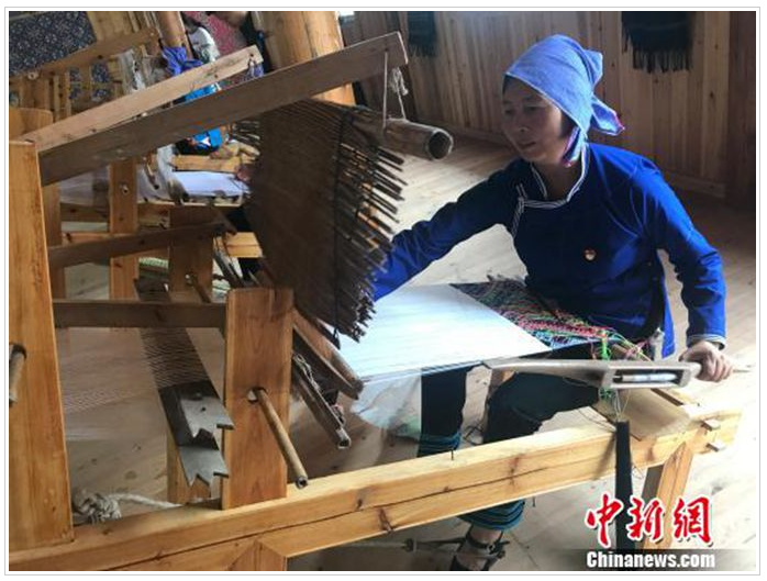 聽聞姐姐在這里織錦每月可拿到3000多元的收入,今年7月,此前在廣東務(wù)工的文坡村二組村民龍練霞干起了這份家門口的工作,再也不想外出了?!凹确奖阏疹櫦胰耍挚梢猿榭崭牲c(diǎn)農(nóng)事?!苯衲?0多歲的龍練霞說。和她一樣,看到侗錦的銷路慢慢打開了,村里許多在外務(wù)工的年輕人也紛紛返鄉(xiāng),拾起祖輩們的老手藝。