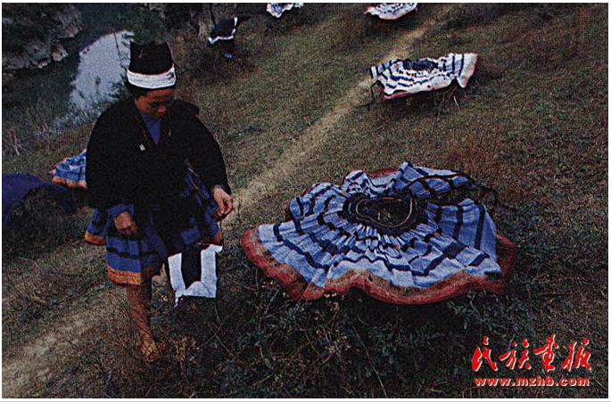 畫好的白布放進(jìn)盛有牛膠和藍(lán)靛的缸里浸染7— 10天,當(dāng)布匹染成深藍(lán)色時(shí)拿出,再放入盛有草木灰的熱水中,用灰水將粘膏脫去,清水洗凈后晾干,就成了一塊有白色花紋的蠟染布。白褲瑤婦女在白色的花紋上繡上彩色的絲線,再把三幅繡有圖案的布連成一塊4米長的裙布,在裙腳邊上縫上一條手掌寬的黃色蠶絲,最后用2 條棉繩穿過裙頭勒緊,百褶裙就做成了。一條百褶裙從紡線到完成據(jù)說需要兩到三年的時(shí)間。
