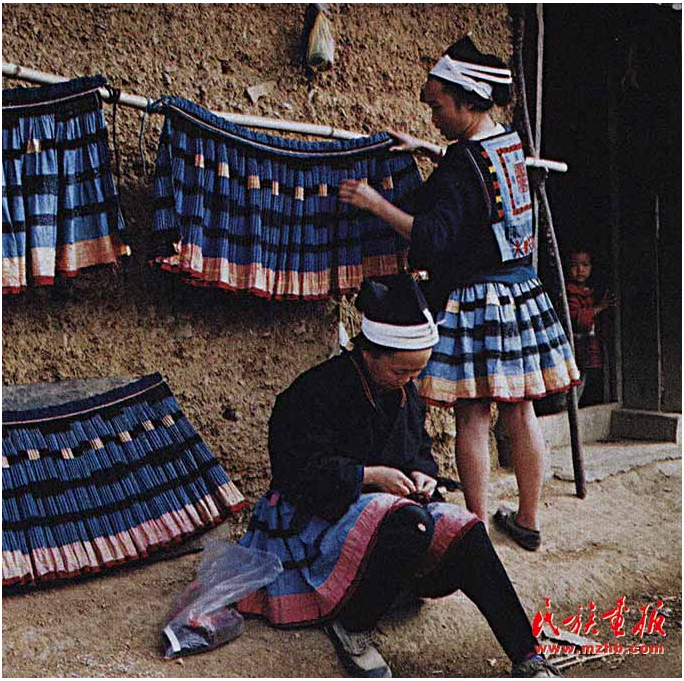 百褶裙是白褲瑤婦女一年四季的服裝,做工十分復(fù)雜。她們把織好的土布剪裁好,用竹片蘸著當(dāng)?shù)厣L的粘膏樹的汁液把圖案畫在白布上。白褲瑤服裝的圖案都是祖先傳承下來的,世世代代延續(xù)至今。