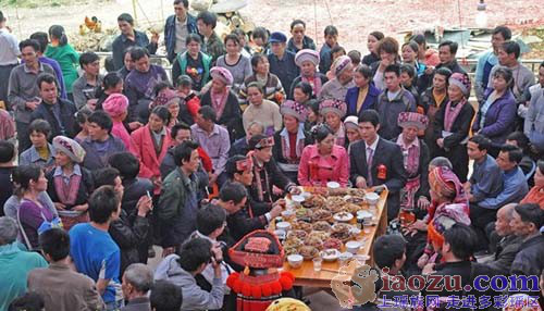 然后送親的隊(duì)伍(瑤家叫“親家客”)開始上路。不論男女老少、長輩晚輩,新娘的父母邀請到的一般都可以去送親,送親時,伴娘必須撐著紅傘為新娘遮陽擋雨,意為新娘的純潔。新娘身上還會披著一塊三尺六長的紅布,以作路上驅(qū)邪辟邪,待將到新郎家時,新郎家迎親隊(duì)伍吹著嗩吶,行接親禮,新娘在入村的路口處要“上刀山、過火海”表示對新郎的忠貞。新郎家燃放鞭炮,敲鑼打鼓,由新郎家的人牽著新郎新娘,將新娘和“親家客”接到新郎家。接著就是男女雙方的親友坐在一起,由“清水公”(婚禮儀式的主持者,也是說親時的媒人)重復(fù)說媒時承諾女方的各種條件。沒有異議后,開始拜堂。新郎新娘拜堂分為拜天地,高堂,拜兄弟姐妹等。拜天地和高堂要12拜,每一拜由6小拜組成。拜完堂后,新娘由伴娘送進(jìn)新房,取下新娘頂在頭上的紅蓋頭,婚禮儀式就算完成。