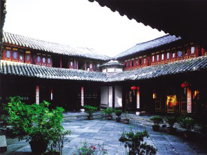 云南大理市喜州“四合五天井”院落。白族將一幢三開間二層的房屋稱為“一坊房子”。一坊房子是普通百姓最常見的住房,即底層三間一明兩暗,明間為堂屋,安設六扇花格門。兩側次間為臥室,設單扇門和格扇窗,前面有臺階和寬敞的廈廊。樓上三間敞通,一般不隔間,依房柱分區(qū)域,面對天井設格扇窗。中間明間靠后墻設神龕,里間當書房,放書柜和書桌,人口多的也放床當臥。