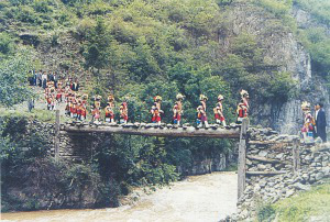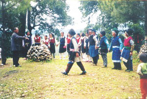 頌藥仙活動(dòng)各村為陣,是一項(xiàng)以傳授藥物知識(shí)和防病方法為主題的歌舞活動(dòng)。早早吃過(guò)晚飯后,人們集中到白天洗揀藥物的水邊,用青松和花草編扎的轎子抬上藥仙的肖像,敲鑼打鼓、載歌載舞,把藥仙抬到她的化身“定居”的山林中,舉行頌贊藥仙功績(jī)的儀式。活動(dòng)場(chǎng)地四周,插遍各種花枝,花枝上掛滿(mǎn)姑娘們精繡的荷包,荷包中裝的是各種治病的藥粉。場(chǎng)中央燃燒著熊熊篝火,火邊供著藥仙的肖像。參加活動(dòng)的人,各持兩束用藥用植物編成的“花束”,在歌頭的帶領(lǐng)下,眾人手舞“花束”,環(huán)篝火踏歌而舞。用動(dòng)聽(tīng)的歌聲,歌唱藥仙嘗百草、治疾病的故事;介紹用中草藥防病、治病的知識(shí)……踏歌接近尾聲時(shí),人們便把手中舞耍的“花束”丟進(jìn)篝火中焚燒,象征把各自身上的病疾丟盡,實(shí)際上是借焚藥草來(lái)達(dá)到消毒防病的目的。